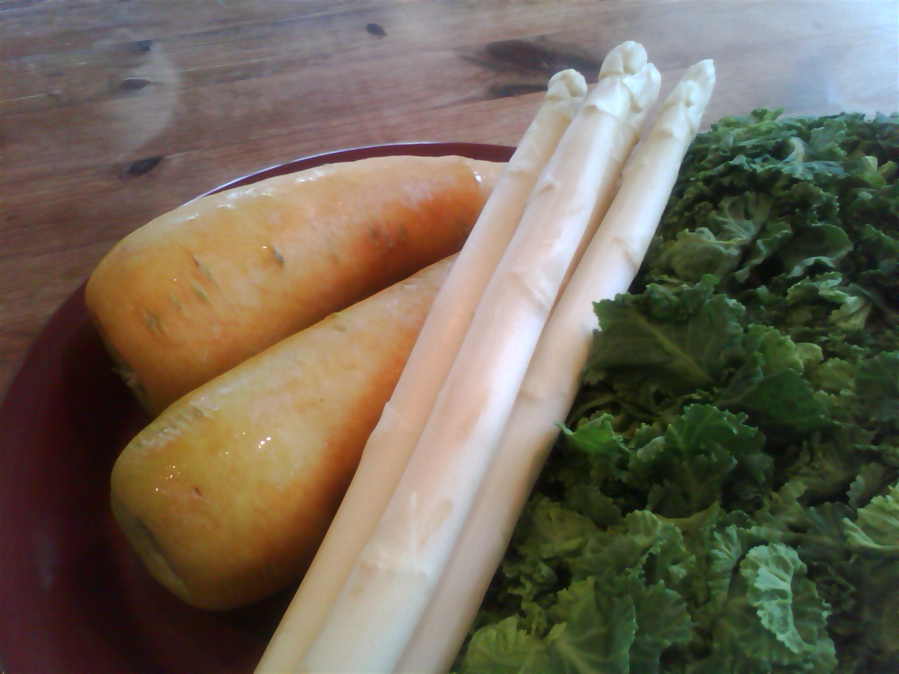 今日はプチベール(ケールと芽キャベツからできています)、 ホワイトアスパラ、 金美人参(鮮やかな黄色で普通の人参より甘いです)を使った 温野菜サラダを作りました