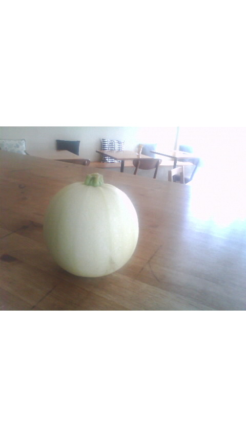 これは何のお野菜でしょう… 大きさはソフトボールより一回り大きい位 なんと丸ズッキーニです 今朝農家さんの朝市で買いました〜